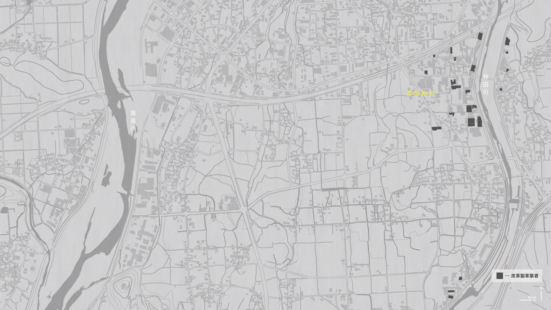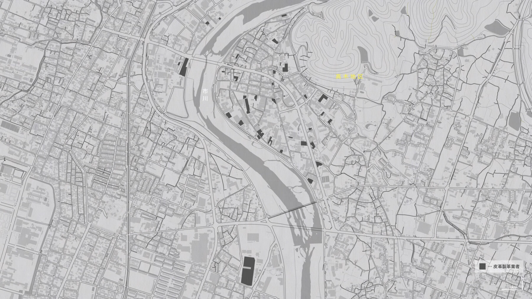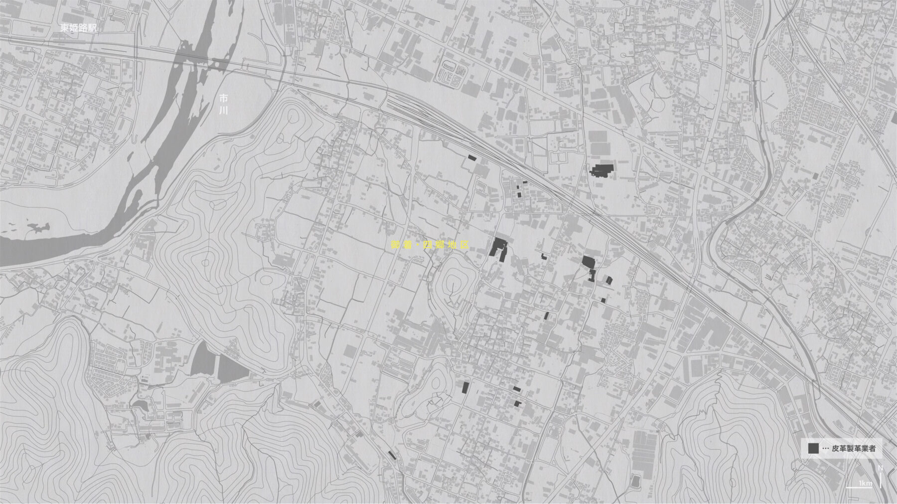 日本では、兵庫県の姫路市 / たつの市、東京都の台東区や墨田区、和歌山県の和歌山市、埼玉県の草加市が4大産地といわれている。それらの地域における、皮革・製革事業者の位置をタウンページより抽出し、地図内にマッピングする。その分布と地勢や歴史から関連性を読み解いていく。