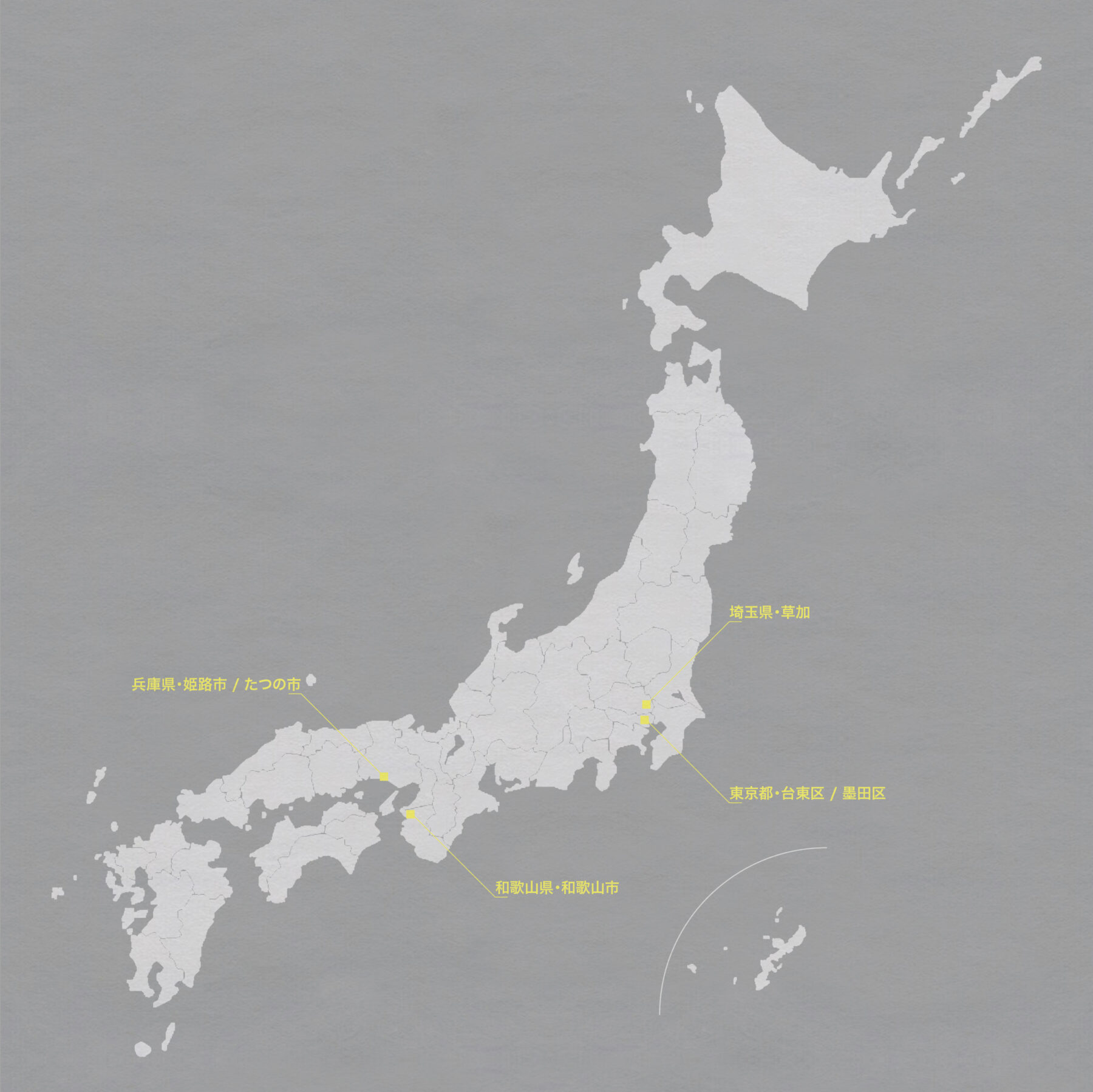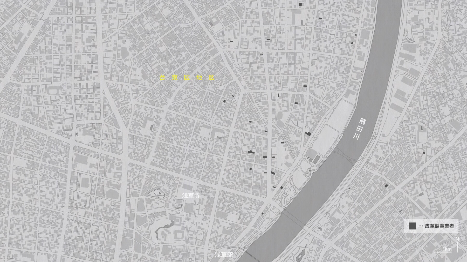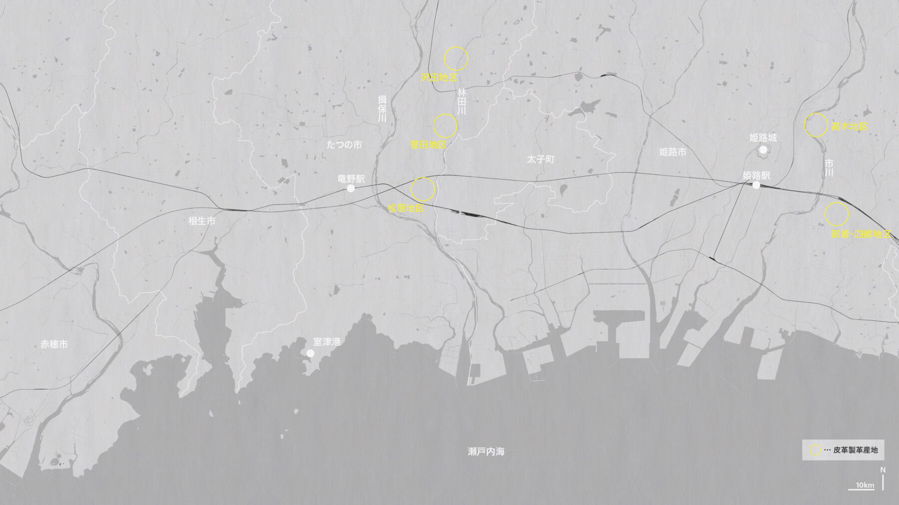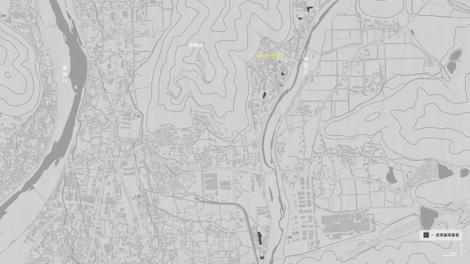 日本では、兵庫県の姫路市 / たつの市、東京都の台東区や墨田区、和歌山県の和歌山市、埼玉県の草加市が4大産地といわれている。それらの地域における、皮革・製革事業者の位置をタウンページより抽出し、地図内にマッピングする。その分布と地勢や歴史から関連性を読み解いていく。