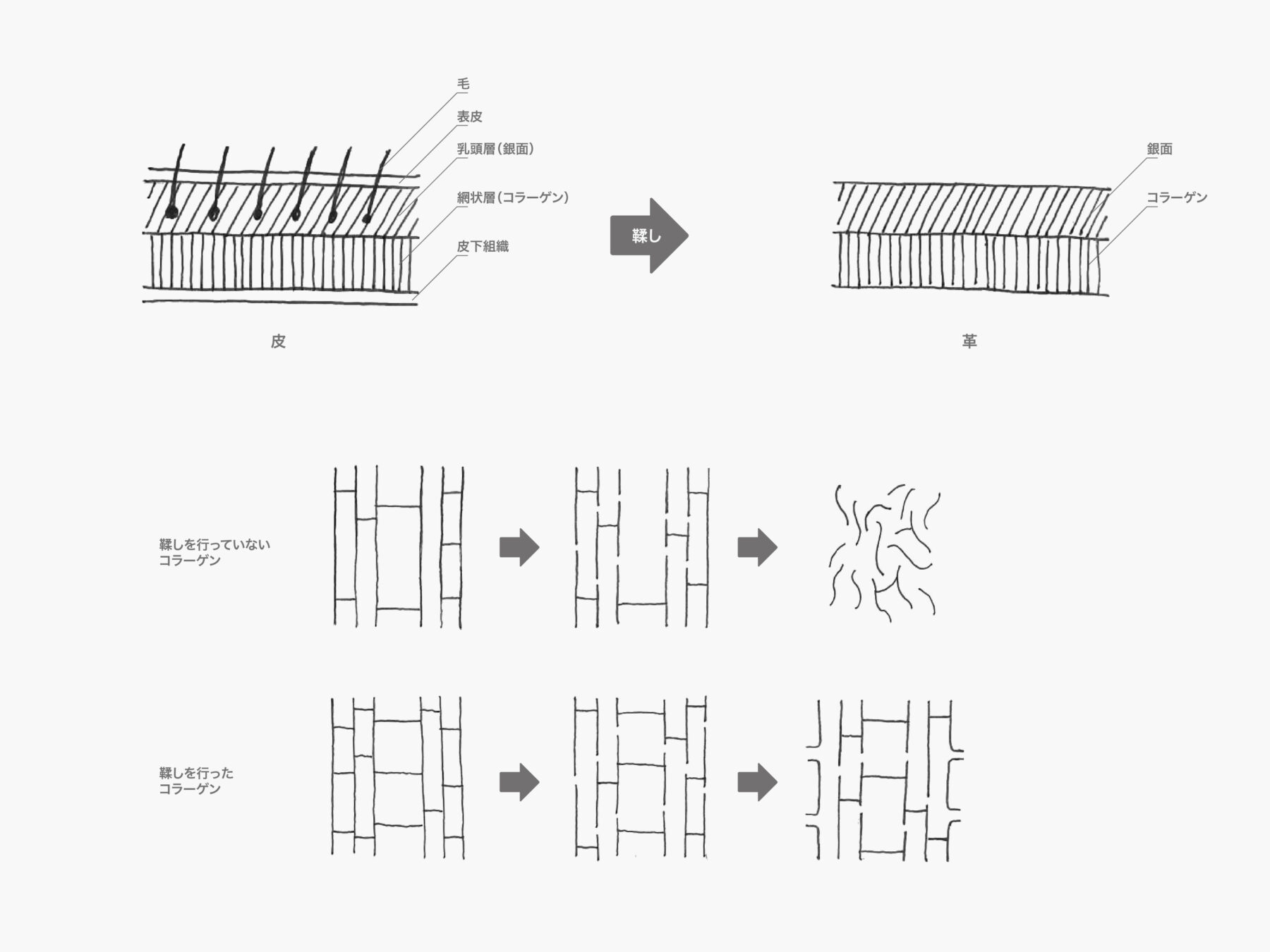 皮の主成分であるタンパク質(コラーゲン)を化学的に架橋し、構造を不可逆的に変化・安定化させ、革や毛皮にすること。