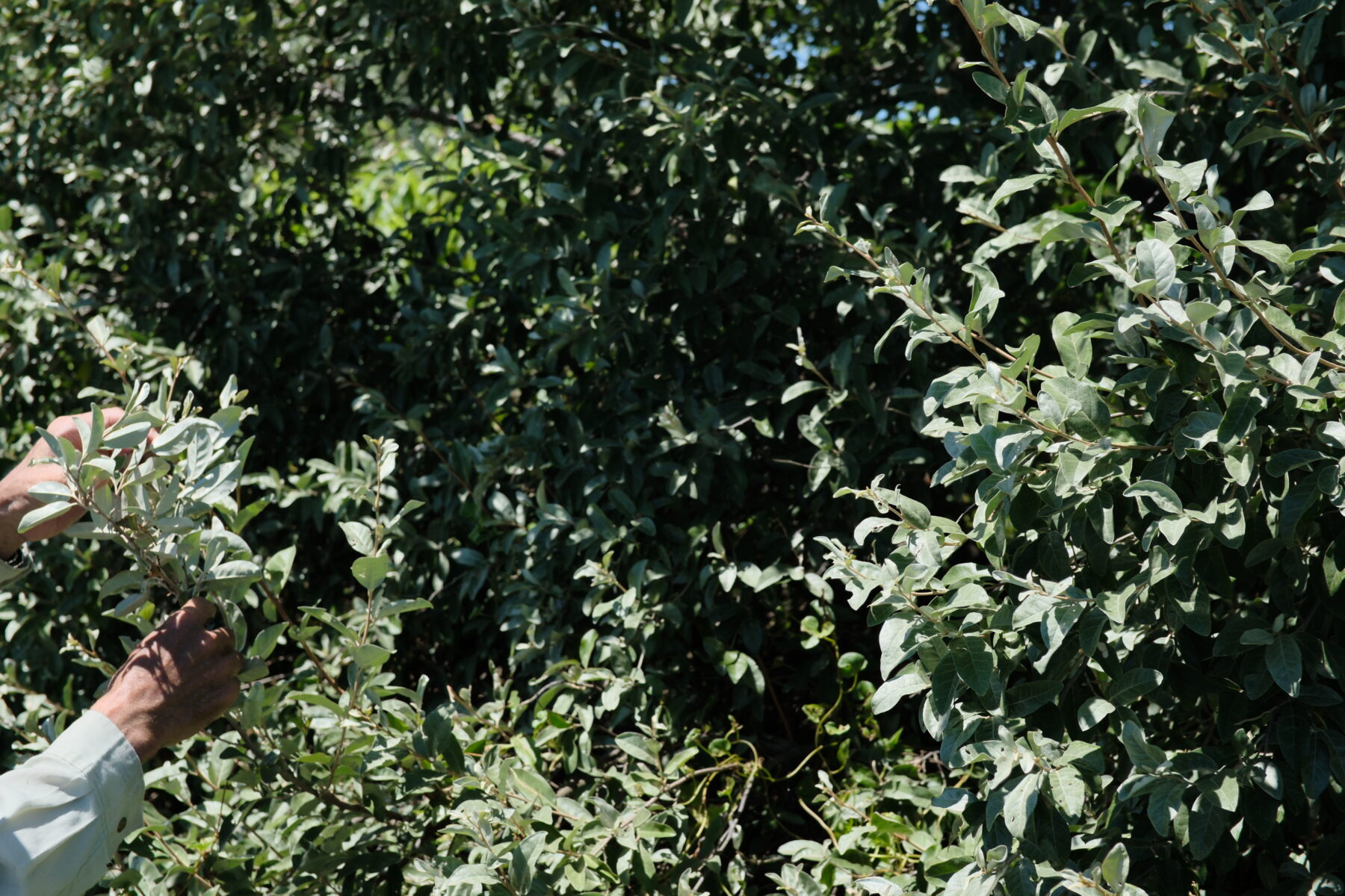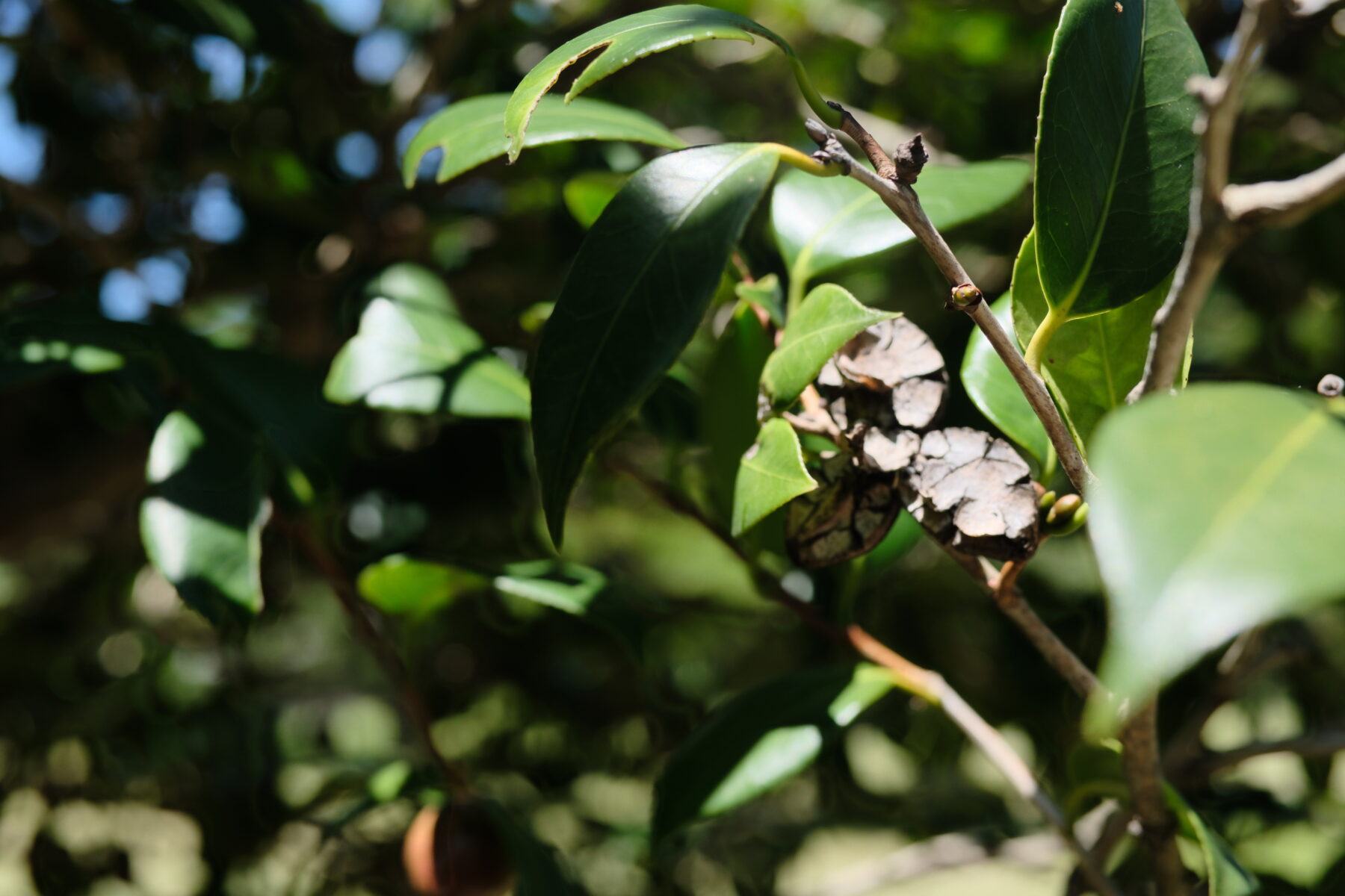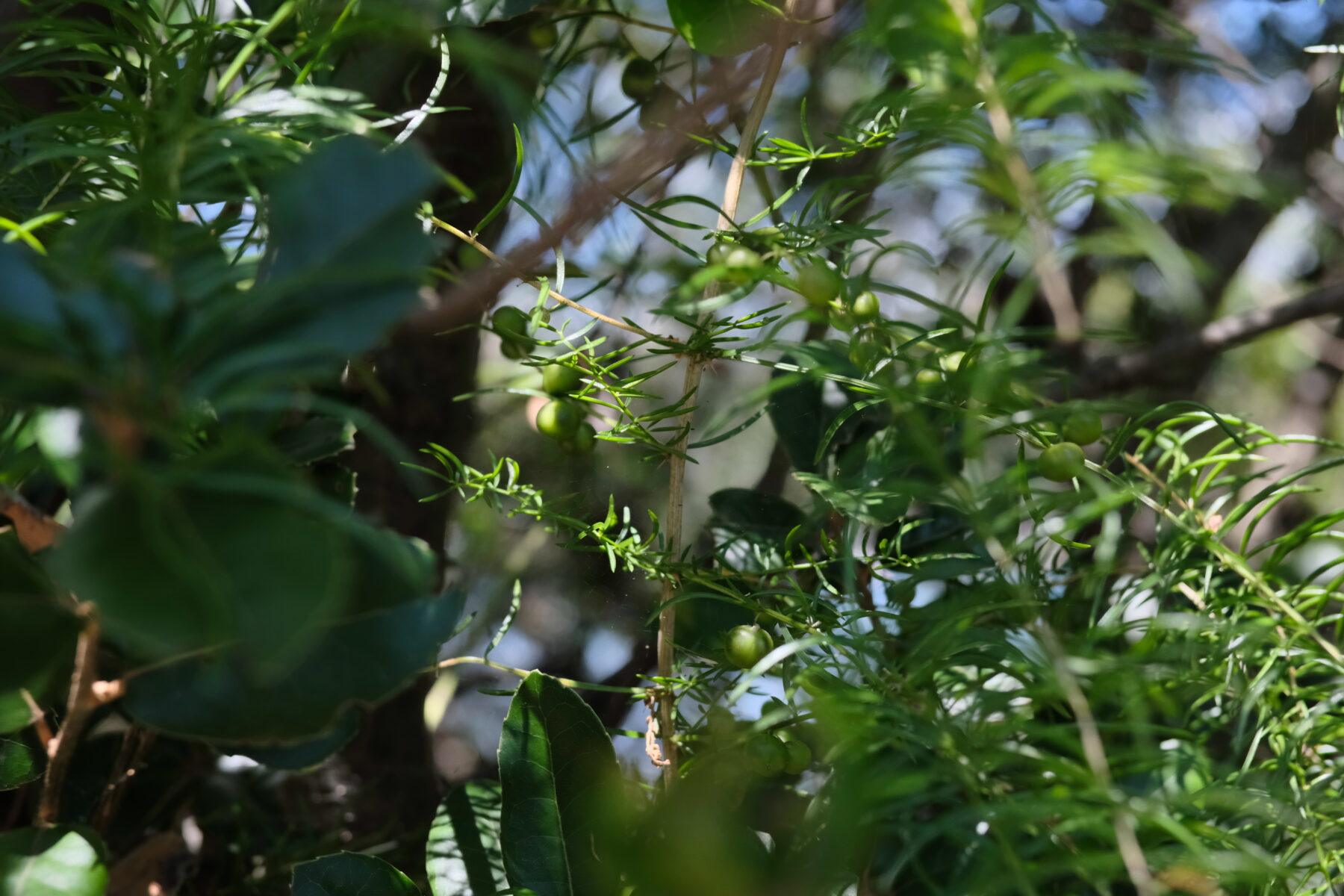 花は9~11月ごろ、枝上部の葉の付け根に集まってつく。この日は7月だが、花芽がついているのが観察できた。