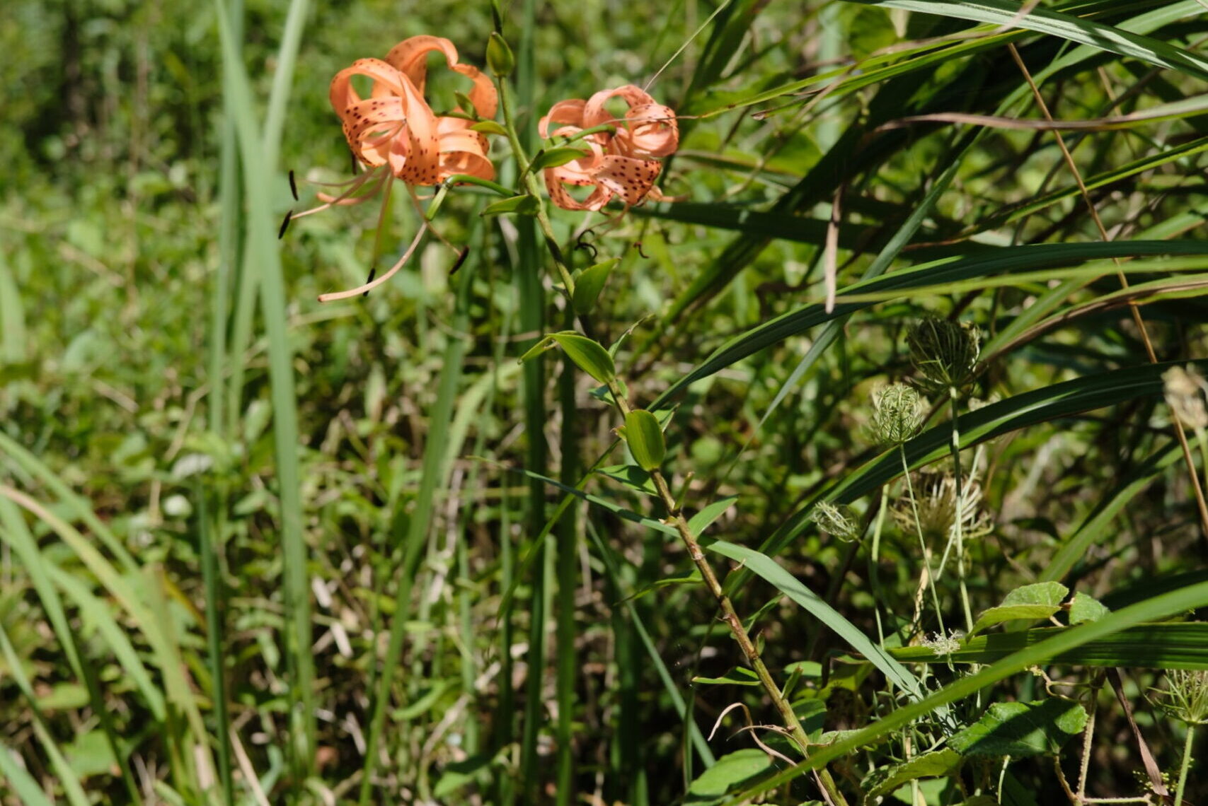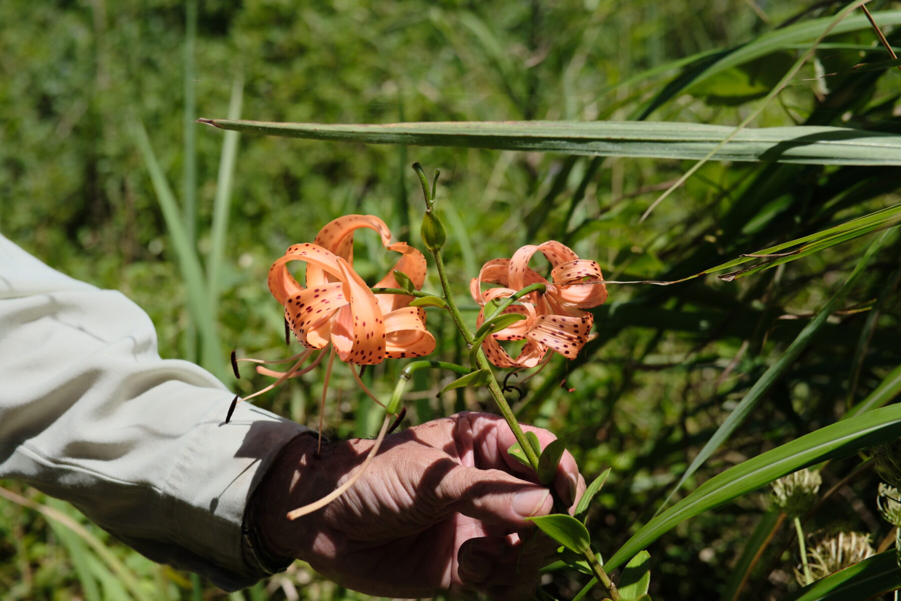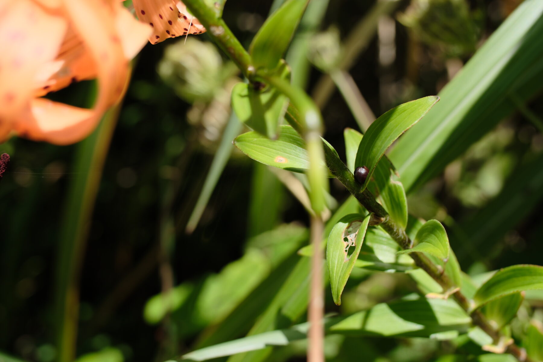 花期は7~8月で、花弁はオレンジ色で暗紫色の斑点がある。種子ではなく、葉の付け根に暗紫色に球根のような形のムカゴを作る。食用にもなる。地下茎も百合根として食用される。