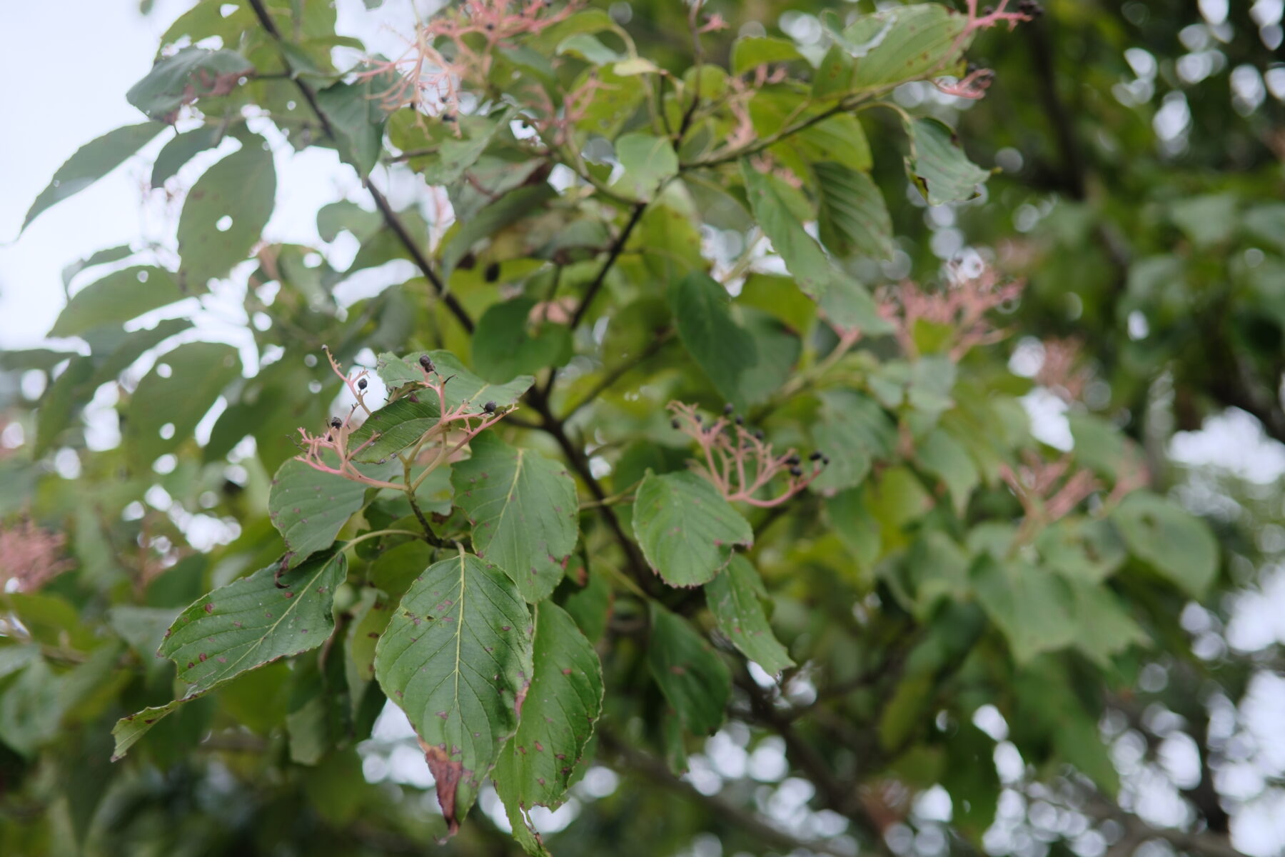 花序及び果序(果実の集り)の枝が、緑色から実がなる頃には赤くなる。実は多くの野鳥が好んで採食する。