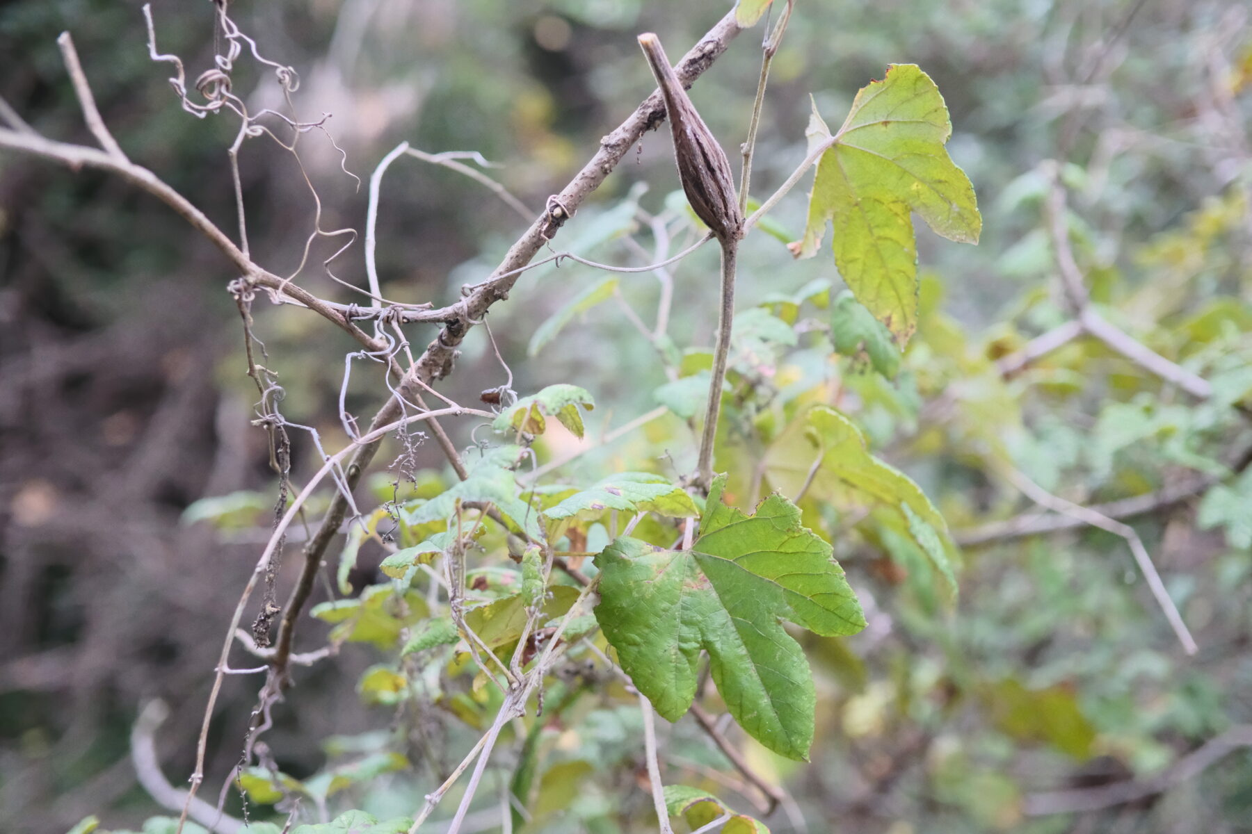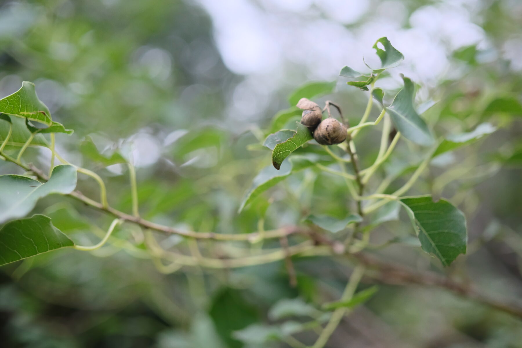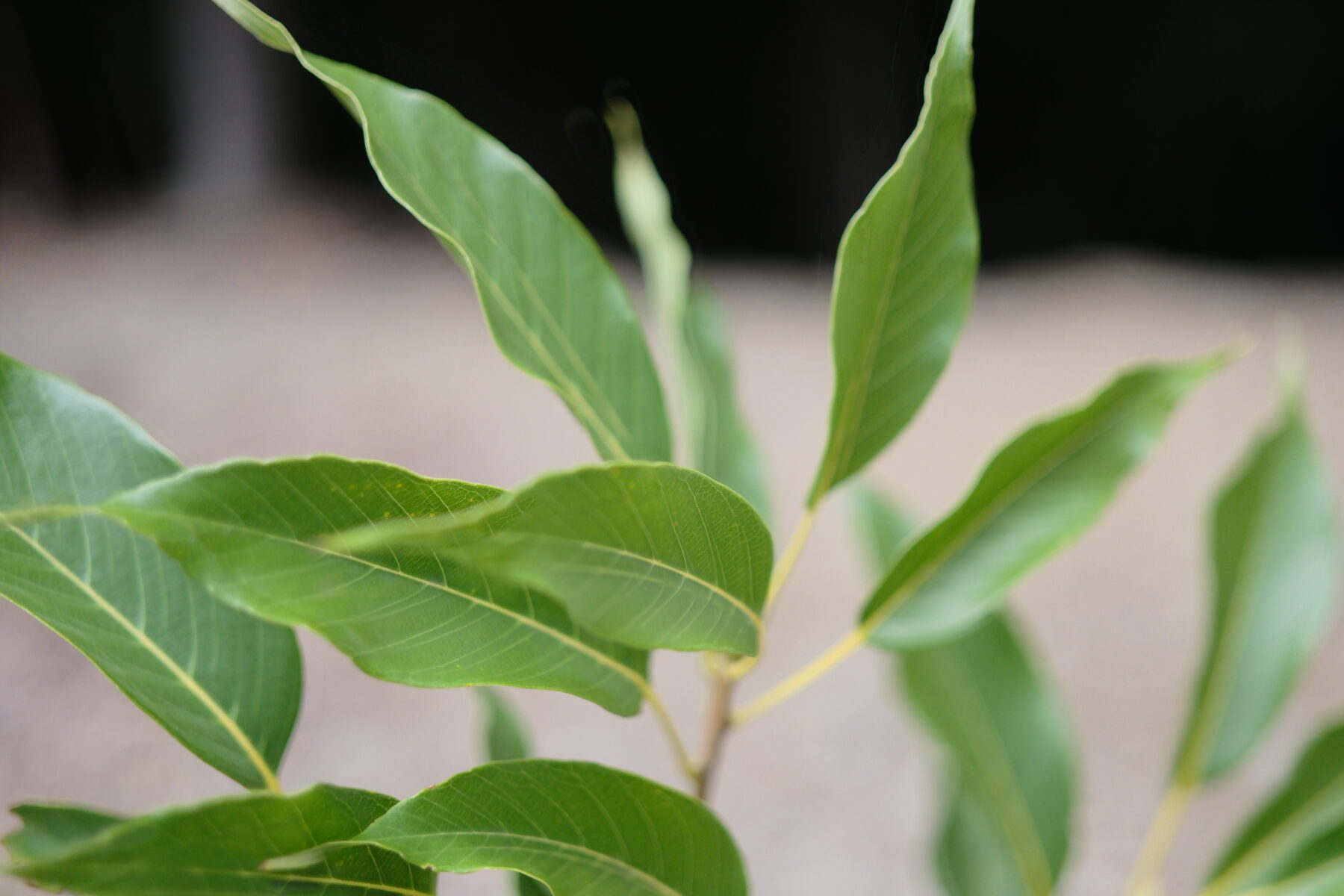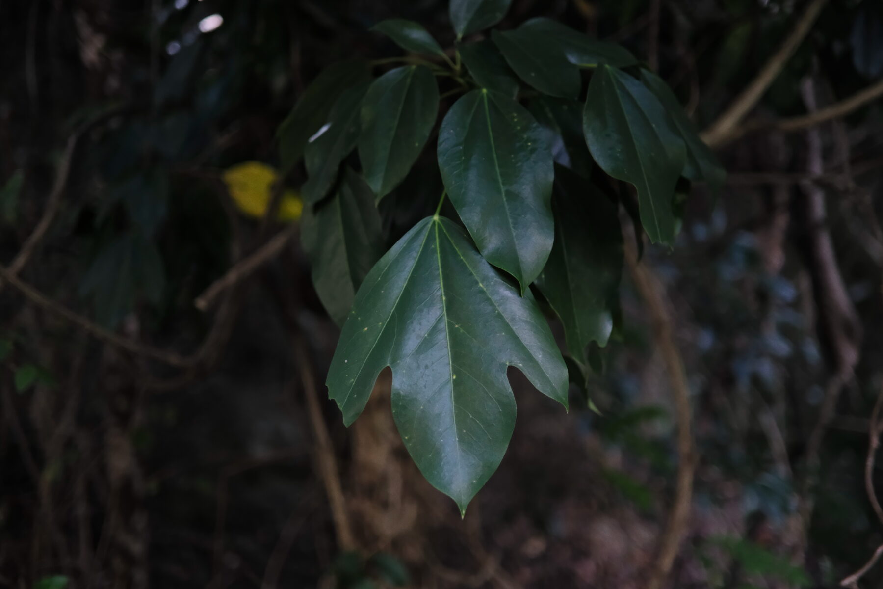 葉は濃緑で光沢があり、稚樹の間は3~5裂に深裂するが、成長とともに卵形の全縁になる。