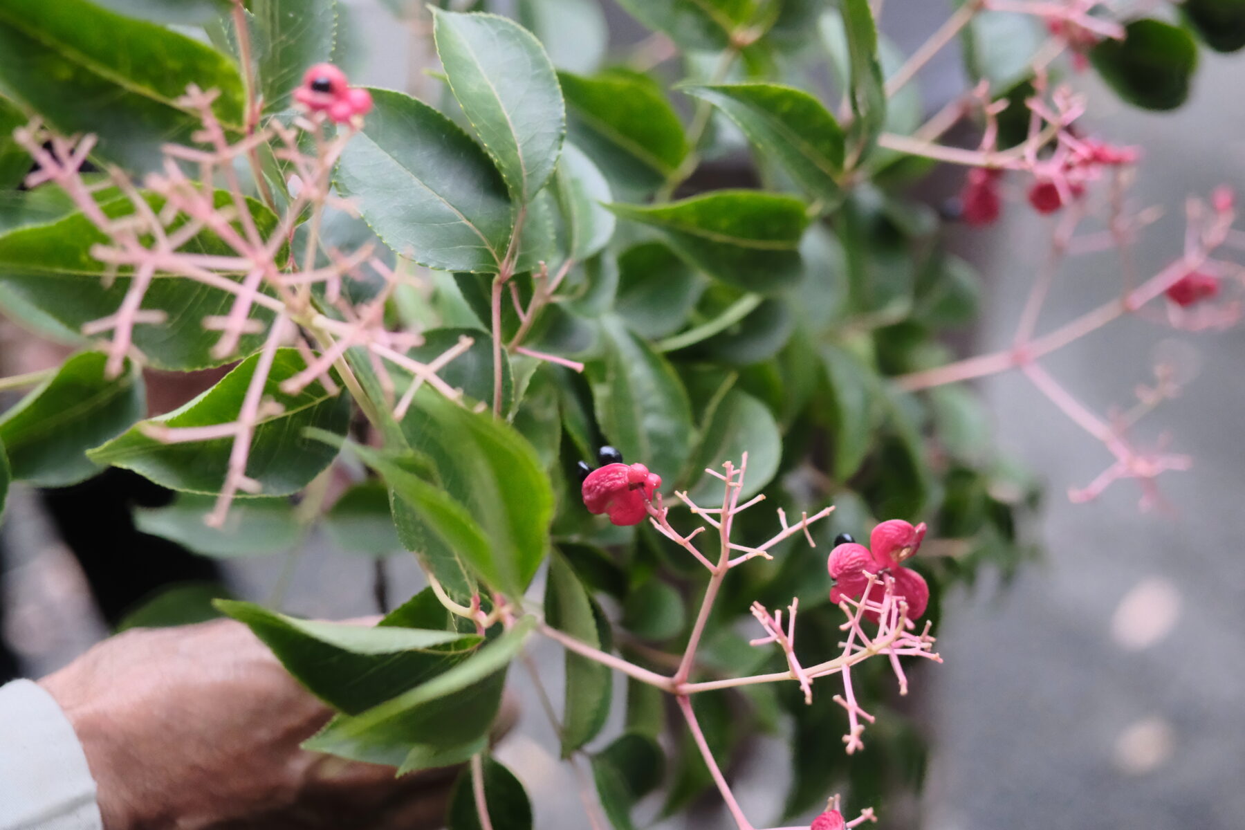 花期は5~6月で、果期は9~10月、果実は肉質で硬く鮮やかな赤色をしている。