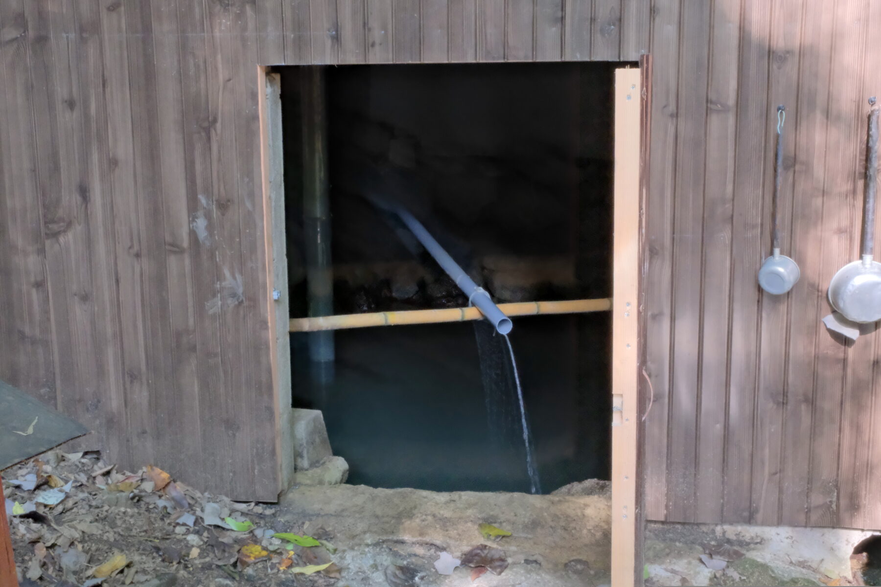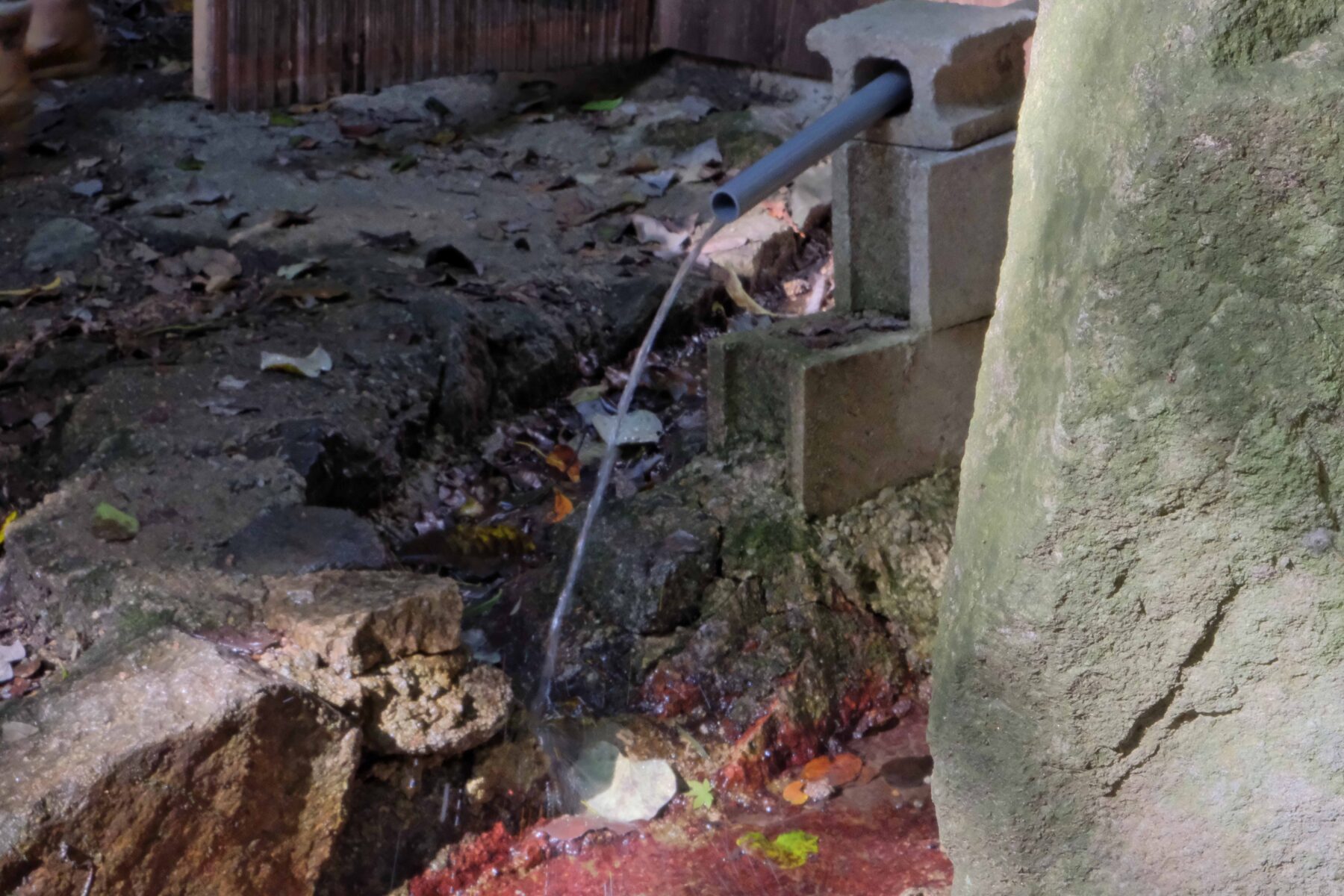 御井の清水の水汲み場。少し前までは壁も屋根も竹で作られていたのですが、新しく建て替えられていた。水量は多くないですが、よく冷えていて美味しい。
