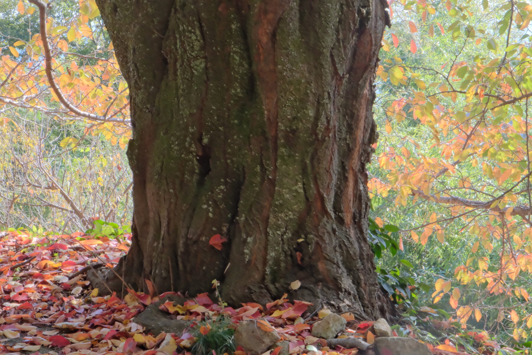 灰褐色の樹皮は、樹齢を重ねるとウロコ状に剥離し続け、オレンジ色の幹肌が現れ、独特な斑模様を描く。